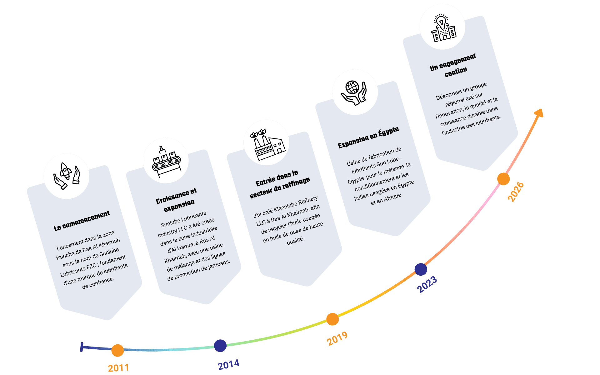 Notre parcours reflète une évolution continue — d’un petit entrepôt à Ras Al Khaimah à un groupe intégré présent aux Émirats arabes unis et en Égypte, bâti sur la qualité, l’innovation et la durabilité dans l’industrie des lubrifiants.